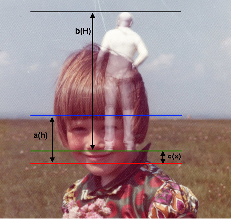 “Perspectiva.jpg” muestra un modelo CGI de un hombre adulto de espaldas superpuesto a la foto. En algunos foros y blogs se ha dicho que debe usarse la regla de las 8 cabezas (es decir, la estatura de una persona adulta es 8 veces la altura de la cabeza) para ajustar una imagen de un hombre a esta foto, pero ello no es directamente aplicable a este caso porque la cabeza se ve más alta por delante que por detrás debido a la quijada, de manera que siguiendo esa regla los pies quedarían más arriba de lo que debieran. Lo que se ha hecho aquí es variar el tamaño y pose del modelo hasta que se ajuste a la persona de la foto de la mejor manera posible. La línea azul es el horizonte, la línea verde representa el suelo sobre el cual está parado el hombre, y la línea roja, cuya ubicación no es conocida a priori, está debajo del hombre a la misma altura del suelo en que está sentada la niña. Las distancias a, b y c son las distancias entre las líneas proyectadas en la imagen, medidas directamente en pixeles. Las respectivas dimensiones reales, a la distancia a la que está parado el hombre (h, H y x) están anotadas entre paréntesis. H es la estatura de la persona, x es el desnivel del suelo y h es la altura de la cámara respecto al suelo en que está sentada la niña, que también es la altura a la que está la frente de la niña, ya que ésta se ve justo frente al horizonte. El motivo para trazar el horizonte y la línea roja es que si trasladamos horizontalmente a la niña hasta el lugar en que está la persona, su frente seguiría quedando en el horizonte y quedaría sentada justo sobre la línea roja, de manera que el valor de h se puede estimar y aprovechar para establecer proporciones. De acuerdo a la edad reportada, probablemente la niña tenía una estatura de unos 110 cm, y estando sentada en el suelo su frente debiera estar a unos 60 cm de altura, entonces éste es el valor estimado de h. Para la estatura del hombre supongamos H = 175 cm. La estatura proyectada en esta reducción de la imagen es de b = 280 pixeles. La proporción entre dimensiones reales y proyectadas se conserva, salvo pequeñas distorsiones, de manera que: a/b = h/H Con esto se despeja el valor de a = b *h/H = 96 pixeles, con lo cual ya es posible ubicar la línea roja y medir directamente c en la imagen, resultando ser de c = 25 pixeles. Luego ya se puede calcular x con esta otra proporción: c/b = x/H Y obtenemos: x = c * H/b = 16 cm Por otro lado, la distancia D de la persona a la cámara está dada por: D = H / [2 * tan (beta / 2)] = 860 cm [FOV = 2 * atan (d / 2f) = 34.5 ° (FOV es el campo visual, d = 36 mm es el tamaño de la imagen en el negativo y f = 58 mm es la longitud focal)][beta = FOV * b / w = 11.6 ° (beta es la altura angular de la persona, w es la altura de la foto completa, que es de 833 pixeles en esta reducción de la imagen)] La distancia de la niña a la cámara se calcula de manera similar, resultando ser de unos 160 cm, entonces la persona estaría 860-160 = 700 cm detrás de la niña. Por lo tanto el desnivel sería de unos 16 cm en 7 m. En consecuencia, la imagen es consistente con una persona de estatura normal parada sobre un suelo con un desnivel despreciable. 2. ANÁLISIS DE DESENFOQUE