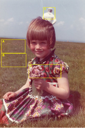 El gráfico “Espectros.jpg” muestra los espectros de Fourier orientacionalmente promediados en escala log-log de las 4 selecciones de la foto que aparecen enmarcadas en “Selecciones.jpg” e identificadas con las letras A, B, C y X. La línea gris corresponde a los espectros medidos, en los cuales la pendiente y las fluctuaciones menores están determinadas por las formas presentes en la foto, y la curvatura está dada por el desenfoque. El plateau y peaks a la derecha del gráfico no son muy relevantes en la modelación de espectros y se deben al patrón gofrado del papel fotográfico. La línea roja punteada corresponde a un modelo idealizado de una imagen desenfocada con ruido blanco que se ha ajustado a cada espectro. Entre paréntesis aparece el valor de “c” incluido en el modelo, que es el diámetro del círculo de confusión (no confundir con el círculo de confusión permisible), el cual es una medida del desenfoque presente en cada selección de la foto. En el modelo usado a veces es posible confundir el efecto del desenfoque con el de la difracción, pero el valor de c en la imagen de la niña, de 0.075 mm, es bastante mayor al efecto esperado para la difracción de 0.02 mm en una foto tomada con abertura relativa N = 16, lo que significa que la foto no está bien enfocada en la niña. Los resultados obtenidos son consistentes con una foto enfocada a una distancia S = 100 cm, y el valor de c para la imagen de un objeto a una distancia D está dado por la conocida fórmula fotográfica: c = [(D-S) / D] * f² / [N * (S-f)] De acuerdo a esta expresión y a los valores antes dados (f = 58 mm, N = 16, S = 100 cm) y a las estimaciones de D realizadas en el análisis de perspectiva, el valor de c para la imagen de la niña (D = 160 cm) es de 0.084 mm, para la imagen de la persona que está detrás (D = 860 cm) es de 0.20 mm, y para todo objeto lejano (D >> S) tiende al valor asintótico de 0.22 mm. Salvo pequeños errores, estos tres valores se aproximan a los correspondientes resultados del análisis espectral, lo que significa que estos resultados son consistentes con una foto enfocada a 1 metro y con las distancias estimadas en el análisis de perspectiva, de manera que las diferencias de enfoque en la imagen son consistentes con la presencia de una persona de estatura normal parada detrás de la niña. 3. RESTAURACIÓN