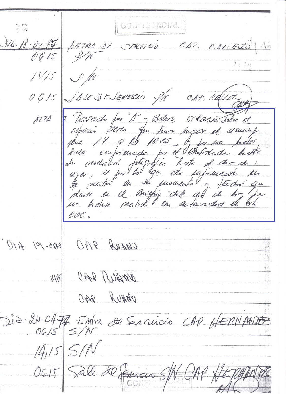 En el trabajo citado inmediatamente antes hice hincapié en el que Mando Operativo Aéreo (MOA) buscó archivos de casos ovni en base a listas de avistamientos que yo les facilitaba. Bastantes de esos avistamientos eran más que presuntos (y probablemente apócrifos), pues procedían de artículos o fuentes sin verificar. Pero aún así, en mi opinión, había que rastrearlos. Una de las observaciones era de la un supuesto “objeto discoidal perseguido por un caza F-4 cerca de Port de la Selva (Gerona)” ocurrida el 18 de abril de 1977. A la vista de la orden de búsqueda de datos realizada por el general jefe del MOA, en noviembre de 1992 el Grupo Central de Mando y Control (GRUCEMAC), la unidad que centraliza la información de detecciones radar y el envío de aviones en misión de interceptación, contestó adjuntando la hoja correspondiente de los libros de registro. Allí no aparece vestigio alguno que confirme un scramble ese día en Cataluña. Lo que si hay es una anotación sobre una violación de espacio aéreo del día anterior, hecho que no es infrecuente y que no tiene nada que ver con los ovnis.