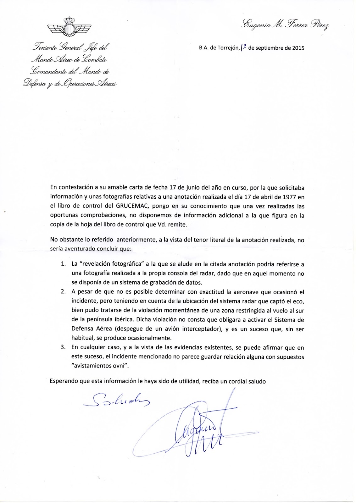Firmada el 1 de septiembre por el jefe del MACOM y comandante del Mando de Defensa y de Operaciones Aéreas, teniente general Eugenio Ferrer, la respuesta ha sido muy detallada y precisa, informando que no es que se hubieran tomados fotos desde ningún avión (como se podría haber interpretado de la lectura de la breve anotación de los libros) sino que se hicieron simples capturas fotográficas de la pantalla del radar, “dado que en aquel momento no se disponía de un sistema de grabación de datos”. La carta también señala que dada la ubicación del radar que detectó la aeronave intrusa (se trató del EVA-3, “Bolero” en nombre clave, situado en el monte Negrillo, en Constantina, Sevilla), “bien pudo tratarse de la violación momentánea de una zona restringida al vuelo al sur de la península ibérica”. La prolija información del general Ferrer también añade que “no consta que obligara a activar el Sistema de Defensa Aérea (despegue de un avión interceptador)” y que se trata de “un suceso que, sin ser habitual, se produce ocasionalmente”. Finalmente, la minuciosa respuesta concluye: En cualquier caso, y a la vista de las evidencias existentes, se puede afirmar que en este suceso, el incidente mencionado no parece guardar relación alguna con supuestos “avistamientos ovni”.
