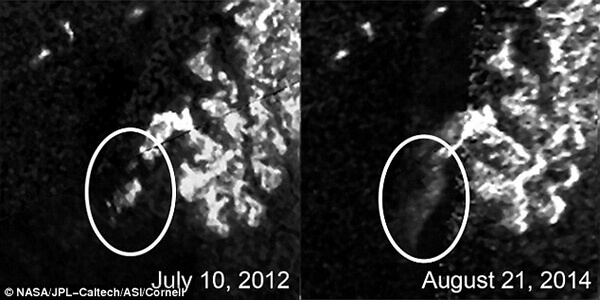 Adding up to the mystery of this oversized moon, researchers have discovered an unusual feature that seems to defy any logical explanation so far. Images received by Cassini orbiter revealed how in July 2012, a huge chunk of land measuring approximately 100 square miles (260 square kilometers) has surfaced from beneath the Ligeia Mare, one of Titan’s largest seas. On August 21, 2014, this alleged island disappeared under a shallow portion of the sea, baffling the scientific crew that was unable to find a precise explanation.