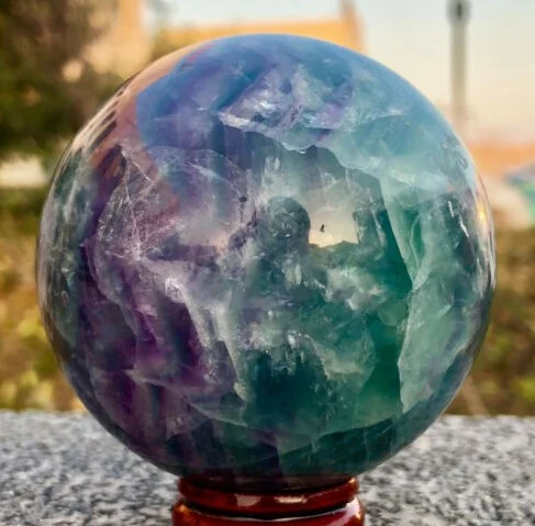 This is a beautiful, large, highly polished, green and blue-purple Fluorite Sphere with what is referred to as wisps or feathers of Sollecito but is more likely a presence of Hemimorphite, Willemite or Aconite, due to the fascinating white inclusion being recently mineralogically tested as a Zinc Silicate. Hemimorphite, Willemite or Aconite are all wonderful types of Zinc Silicates.