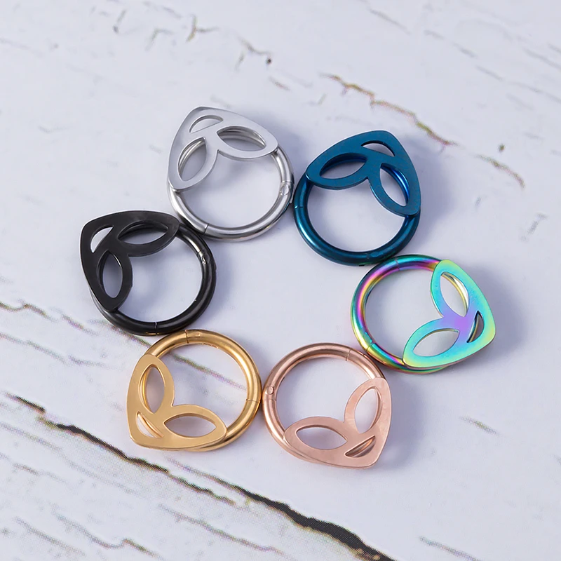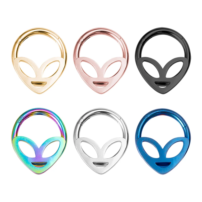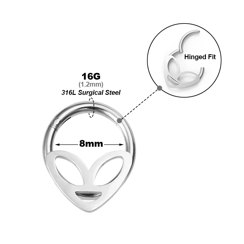 Look lovely and feel amazing with this septum clicker featuring a cute alien head design perfect for any occasion. The stainless steel straight barbell septum clicker has a hinge that easily opens and clicks closed for a secure fit.