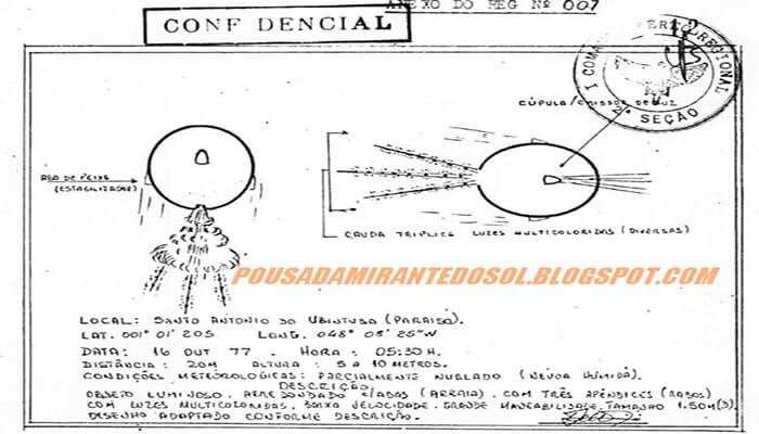 The story of a terrified woman appears inside the recently declassified report. A resident of Baía do Sol recalled how on October 18, 1977, a powerful light had inundated her room all of a sudden, and she could see a green light that was scanning her face and felt the air heating up around her. Before realizing what was happening, the light turned red and a peculiar being, “like a man, wearing something like a driver’s outfit” was pointing something like a gun at her. It was boiling hot when it touched her breast causing great pain as if “there were needles piercing” her skin.