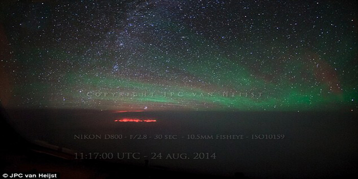 The only cause of the red glow that we could think of was the explosion of a huge volcano just underneath the surface of the ocean, about 30 minutes before we overflew that exact position.”