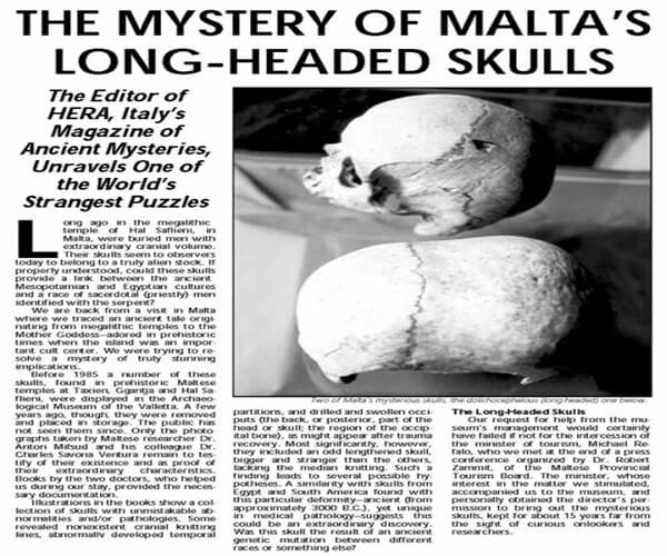 In support of this discovery stands an extract published by the National Geographic magazine in the 1920s describing the first inhabitants of Malta as a race with elongated skulls.