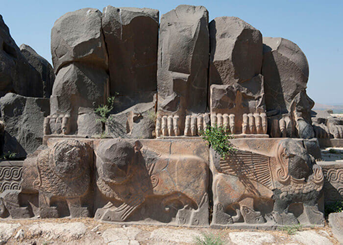 The platform on which the temple stood was guarded on all sides by lions, sphinxes, mountain gods and other mystical creatures with long claws of which only the feet remain, all of them carved from large blocks of basalt.
